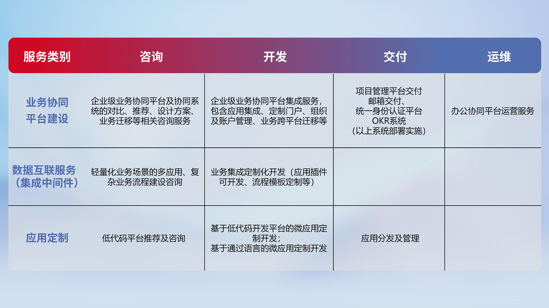针对钉钉、、企微、、、IDaas等平台级产品提供产品的规划、、、方案、、交付、、、定制化开发等服务,,实现如统一协同办公、、、、智能客户服务、、混合会议管理、、智能数据查询、、等业务场景,,,实现数字化转型。。