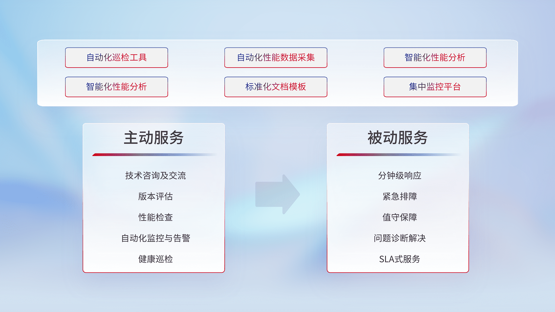 智能化工具和标准化文档,,,,保障服务质量,,,,提供主动服务(包含技术咨询、、、、版本评估、、、性能检查、、自动化监控与告警、、、健康巡检)和被动服务包含(分钟级响应、、紧急排障、、、值守保障、、、、问题诊断解决、、SLA服务)。。。。
